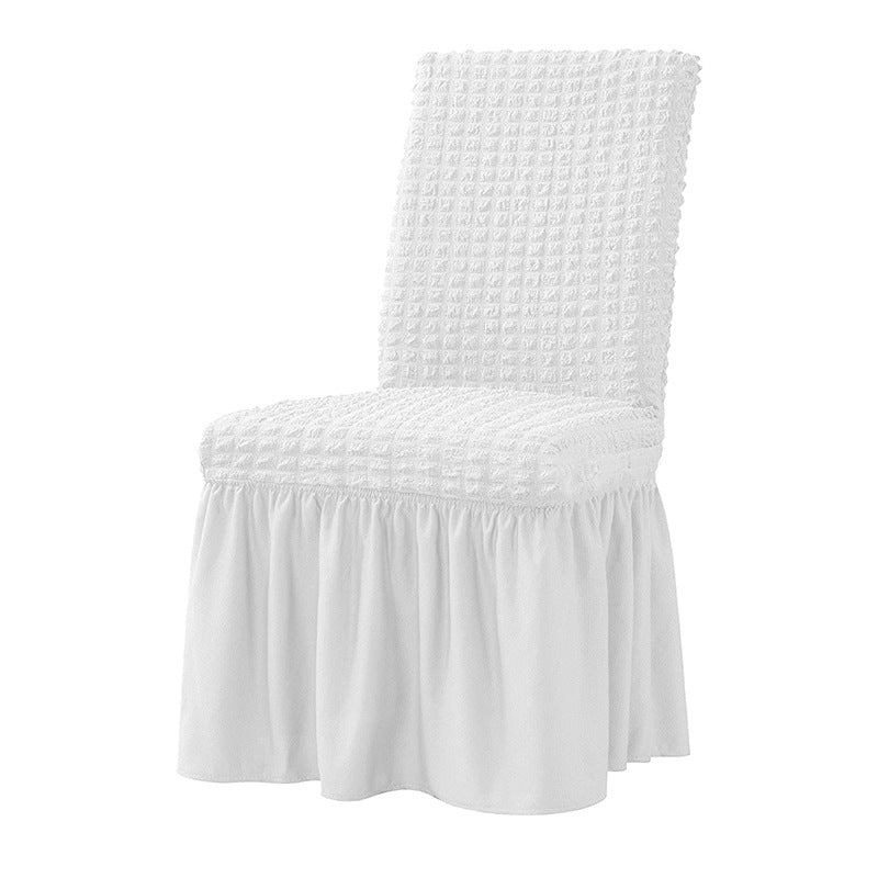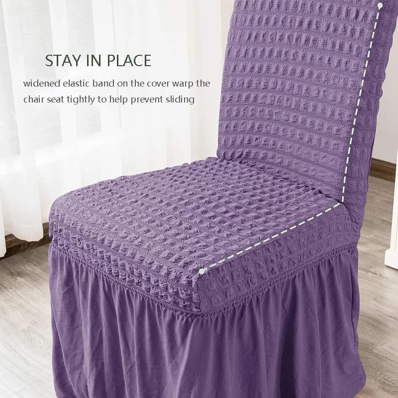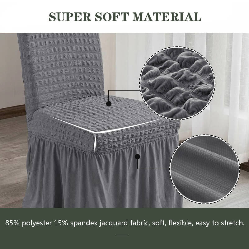 - SUPERIOR FABRIC:85% polyester 15% spandex fabric makes our chair covers more stretchy and durable, ensuring both good function and comfort. The chair cover has ruffle skirt, perfectly covering the chair foot, and the ruffles are light and elegant, so you can feel the elegance in the high-end restaurant at home.