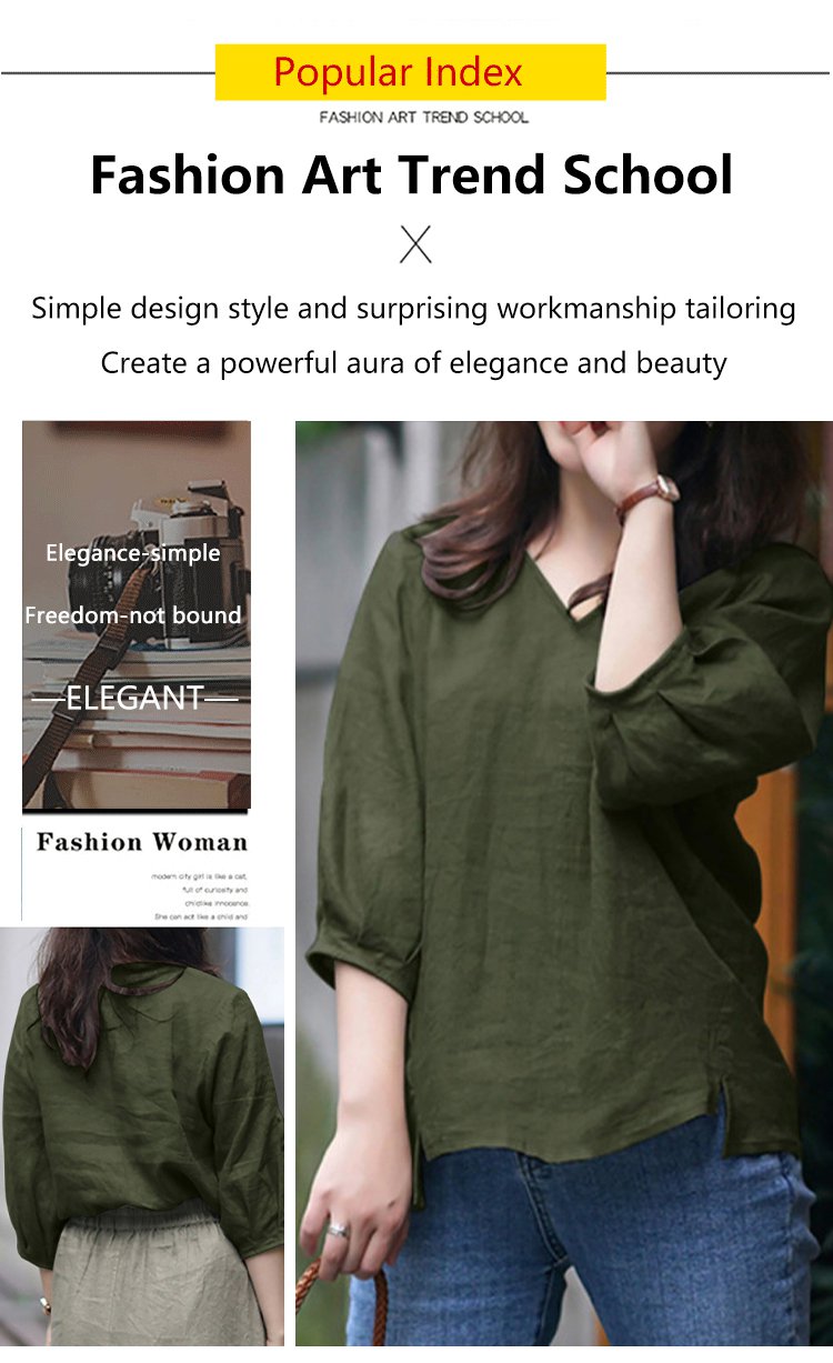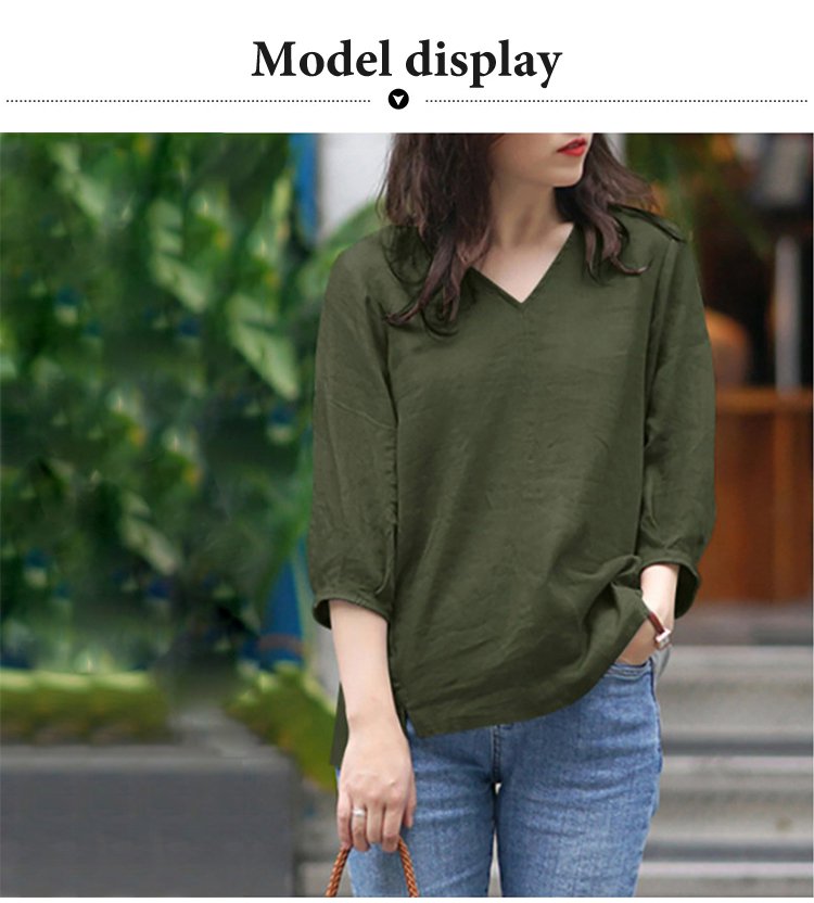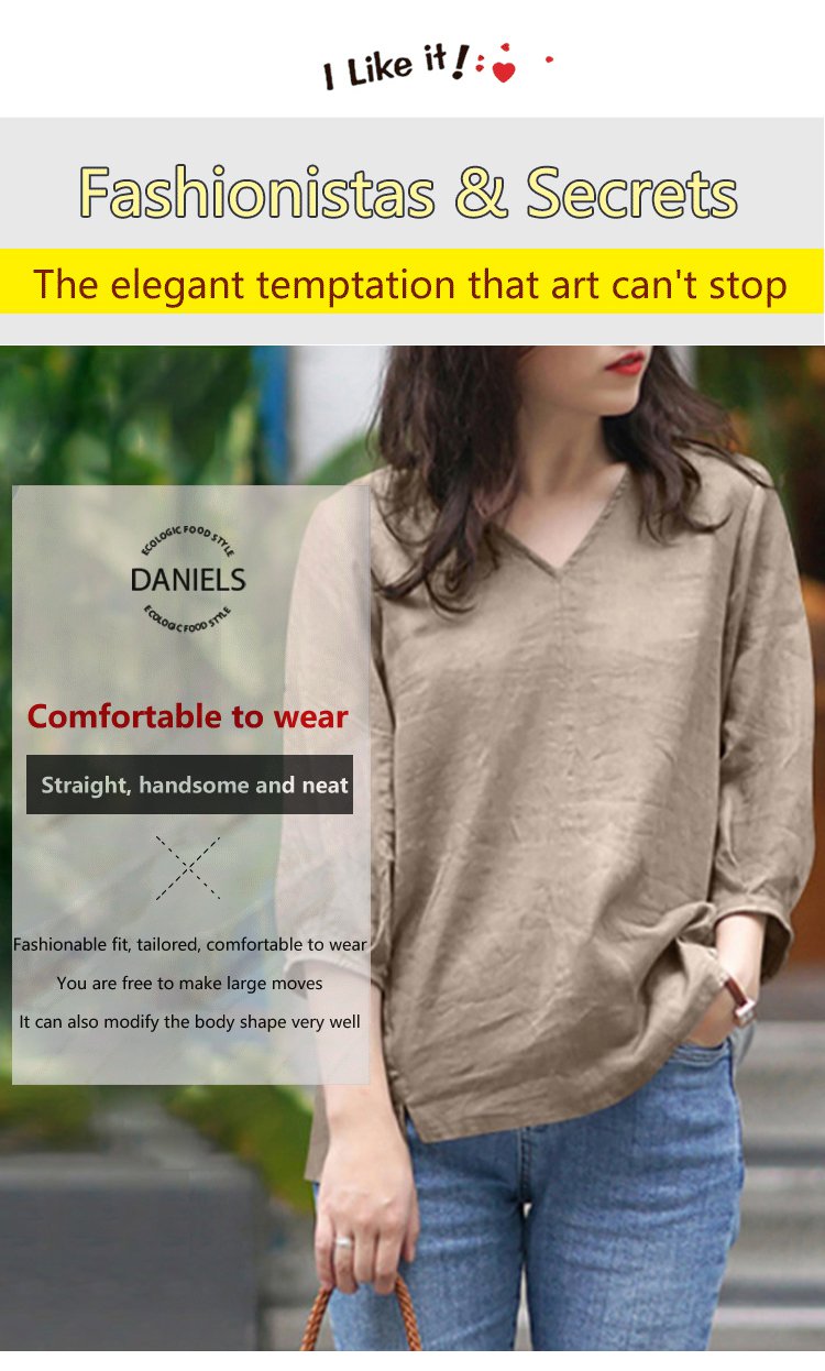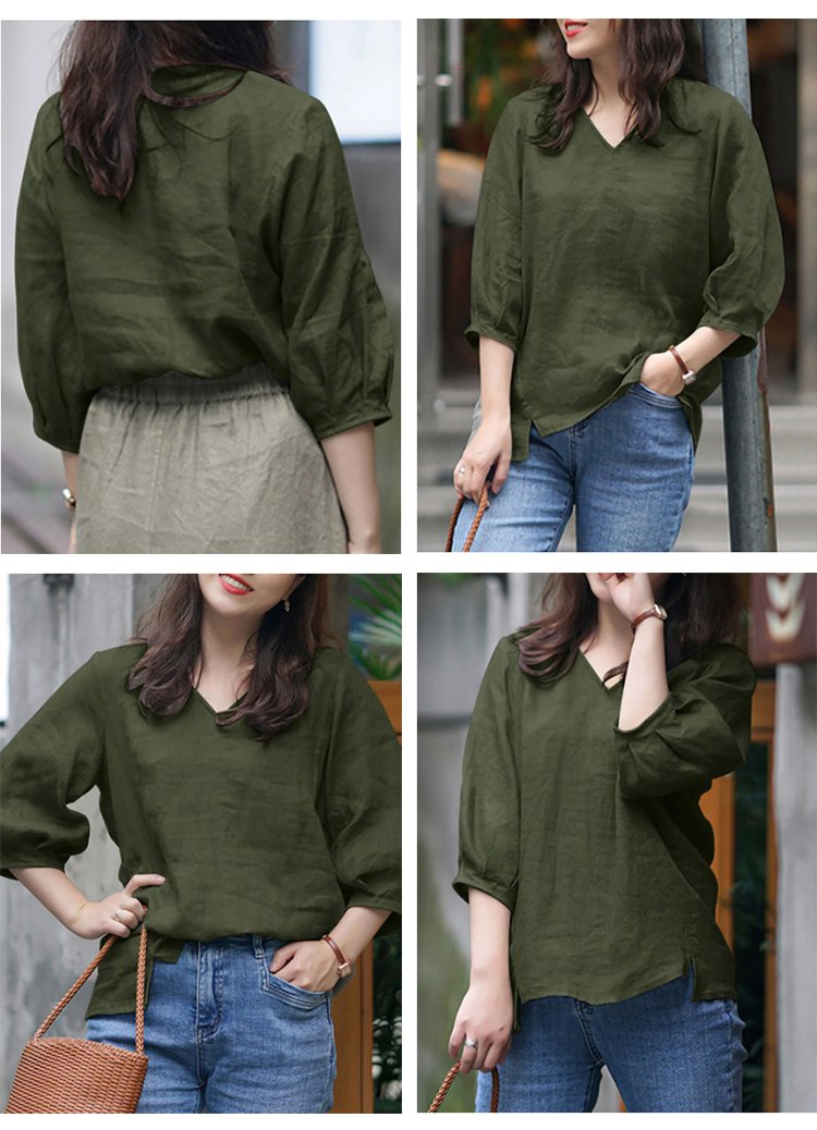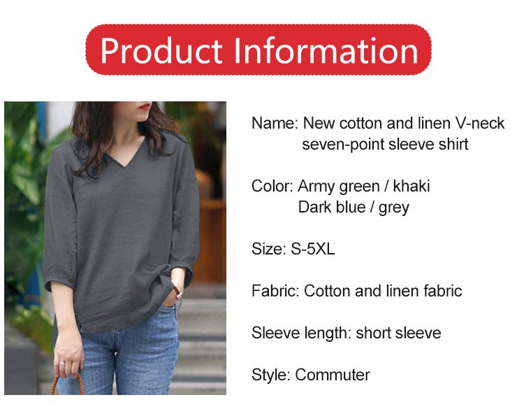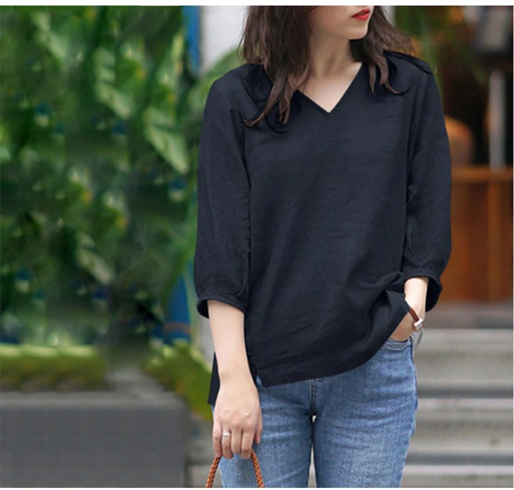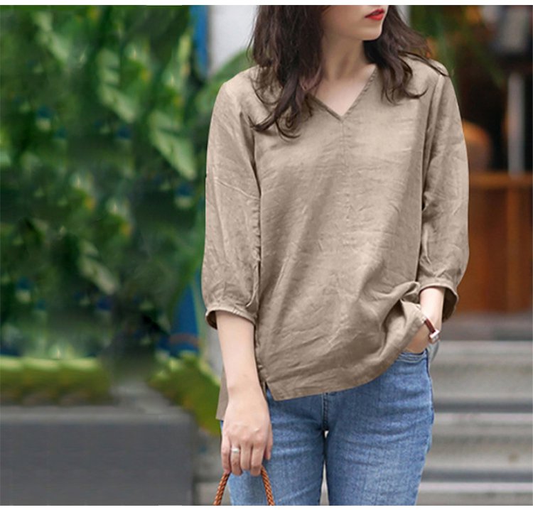 New Cotton And Linen V-neck Seven-point Sleeve Shirt