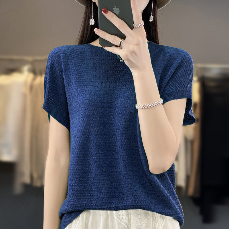 Stay cool this summer with this Knitted T-shirt. This lightweight and breathable T-shirt is perfect for the hot summer months. It features a flattering fit and a classic design with a scoop neckline and short sleeves. Available in a variety of colors and sizes, this T-shirt is the perfect addition to your wardrobe. Get ready for the summer with this stylish and comfortable T-shirt.